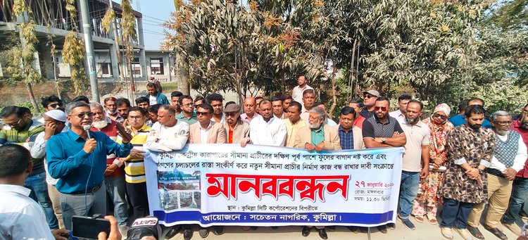 এই অবস্থায় নির্মাণকাজ বন্ধ রাখার দাবিতে আজ মঙ্গলবার (২৭ জানুয়ারি) দুপুর ১২টায় কুমিল্লা সিটি করপোরেশনের সামনে ও নির্মাণাধীন প্রাচীরের পাশে ‘সচেতন নাগরিক সমাজ’-এর ব্যানারে মানববন্ধন হয়। এতে রাজনৈতিক দল, সাংবাদিক, আইনজীবী, ব্যবসায়ী, শিক্ষক, সুশীল সমাজসহ নগরবাসী অংশ নেয়।