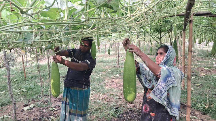 গাজীপুরের শ্রীপুরে বসতবাড়ির চারপাশে পাঁচ বিঘা জমিতে হাইব্রিড জাতের লাউ চাষ করে সফলতার নজির গড়েছেন আক্তার-মর্জিনা দম্পতি। বাড়ির আঙিনা ও পুকুরপাড়জুড়ে মাচায় ঝুলছে শীতকালীন সারি সারি লাউ। সমন্বিত কৃষি খামারের মাধ্যমে তাঁরা স্বাবলম্বী হয়ে উঠেছেন।