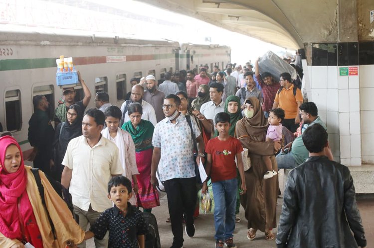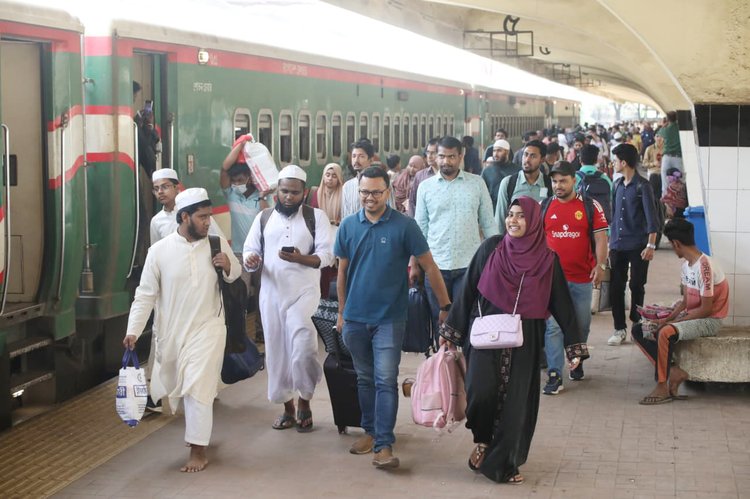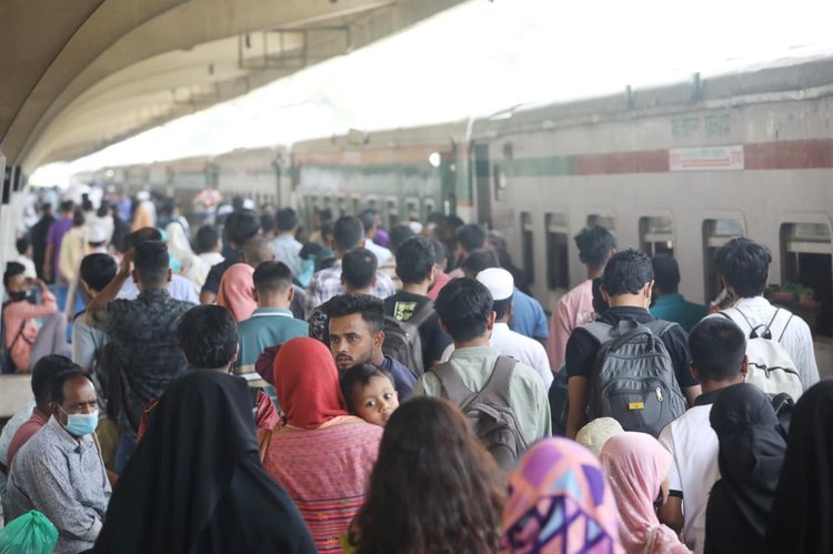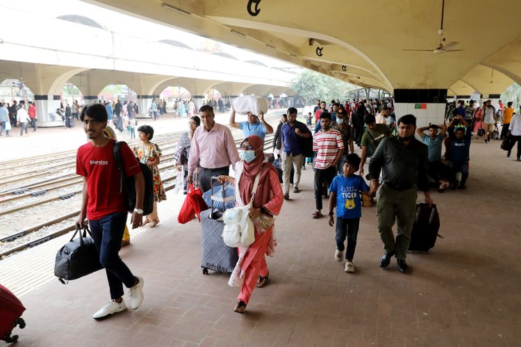 প্রিয়জনদের সঙ্গে ঈদুল ফিতর উদ্যাপন করতে ইতিমধ্যে সড়ক, রেল ও নৌপথে ঢাকা ছাড়তে শুরু করেছে ঘরমুখী মানুষ। আজ শনিবার সকাল থেকেই কমলাপুর রেলস্টেশনে যাত্রীদের ভিড় দেখা গেছে। ঈদযাত্রার ভোগান্তি এড়াতে অনেকেই আগেভাগেই পরিবার-পরিজনকে নিয়ে যাচ্ছেন গ্রামের বাড়িতে। বিভিন্ন গন্তব্যের ট্রেনে চড়ে তারা বাড়ির পথে ছুটছে। কমলাপুর রেলস্টেশন এলাকা থেকে ছবিগুলো তুলেছেন মেহেদী হাসান