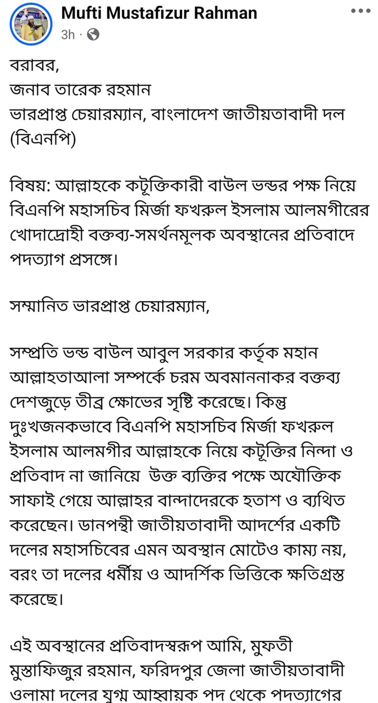 বাউলদের নিয়ে বিএনপির মহাসচিব মির্জা ফখরুল ইসলাম আলমগীরের বক্তব্যের প্রতিবাদ জানিয়ে পদত্যাগের ঘোষণা দিয়েছেন মোস্তাফিজুর রহমান নামের এক ওলামা দলের নেতা।