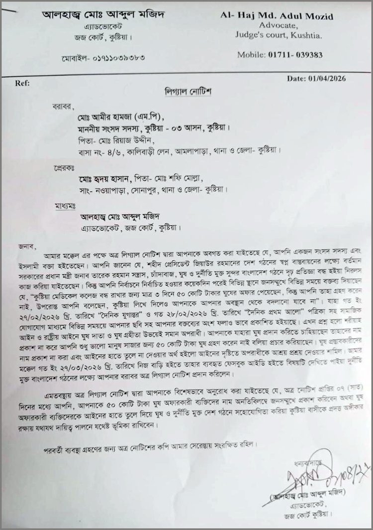 কুষ্টিয়া জেলা ছাত্রদলের আহ্বায়ক কমিটির সদস্য হৃদয় হাসানের পক্ষে আজ বুধবার আইনজীবী আব্দুল মজিদ নোটিশটি পাঠান। তিনি আজকের পত্রিকাকে বলেন, ‘দুপুরের পর লিগ্যাল নোটিশটি এমপি সাহেব বরাবর পাঠানো হয়েছে। নোটিশে সাত দিনের মধ্যে ঘুষ প্রস্তাবকারীর পরিচয় অথবা আইনগত ব্যবস্থা নিতে আহ্বান জানানো হয়েছে। যদি তা না করেন, তাহলে পরবর্তী ব্যবস্থা গ্রহণ করা হবে।’