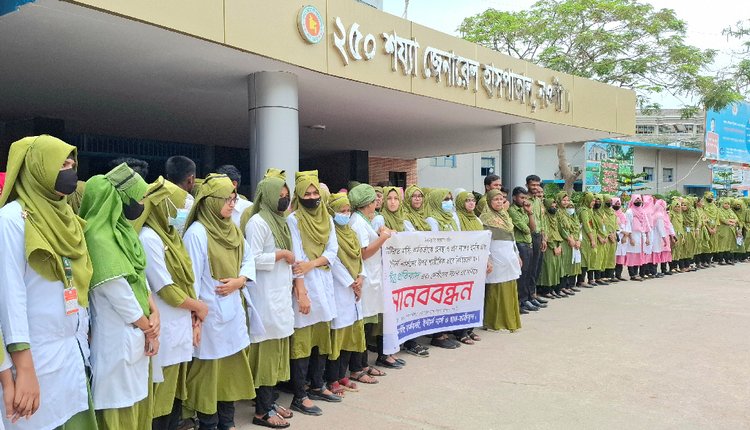 এদিকে এ ঘটনায় নার্সদের হেনস্তা, প্রাণনাশের হুমকি ও শারীরিকভাবে নির্যাতনের বিচারের দাবিতে বেলা ১১টার দিকে নওগাঁ ২৫০ শয্যাবিশিষ্ট জেনারেল হাসপাতালের সামনে নার্স, ইন্টার্ন নার্স ও ছাত্রছাত্রীদের মানববন্ধন হয়।