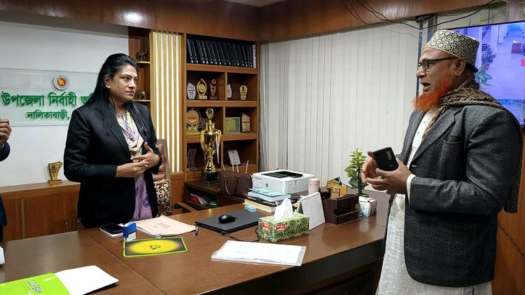 একপর্যায়ে আব্দুল্লাহ বাদশা ইউএনওকে অনুনয় করে বলেন, ‘আমি ৫টার মধ্যেই (ইউএনওর কার্যালয়) আসছিলাম। রাস্তায় গাড়ির একটু সমস্যা হয়েছিল, তাই বারবার ফোনও দিয়েছি। আমাকে একটু দয়া করুন।’