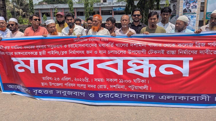 পটুয়াখালীর দশমিনা উপজেলায় সবুজবাগ খালের উভয় তীরে তীব্র ভাঙনের কারণে মসজিদ, থানা কমপ্লেক্স, বাজার, শিক্ষাপ্রতিষ্ঠানসহ অর্ধসহস্রাধিক ঘরবাড়ি ঝুঁকির মুখে পড়েছে। খালের ভাঙন রোধ এবং টেকসই সড়ক নির্মাণের দাবিতে মানববন্ধন করেছেন এলাকাবাসী। বৃহস্পতিবার (২৩ এপ্রিল) বেলা ১১টা থেকে দুপুর ১২টা পর্যন্ত উপজেলা পরিষদের সামনে ঘণ্টাব্যাপী এ কর্মসূচি পালন করা হয়। এতে সবুজবাগ ও চরহোসনাবাদ এলাকার কয়েক শ মানুষ অংশ নেন।