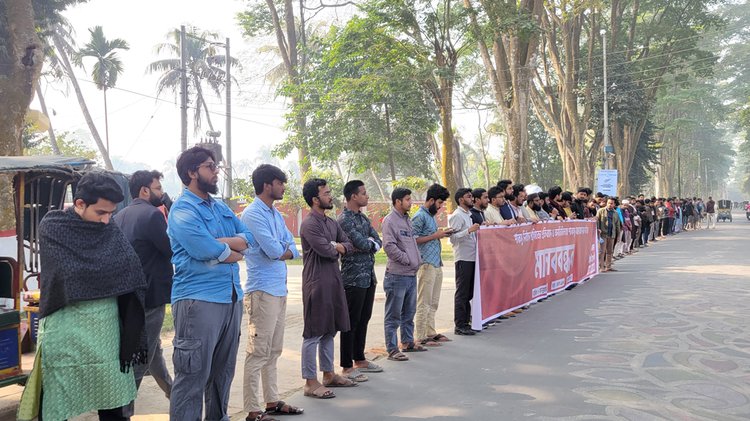 মানববন্ধনে শিবিরের নেতা-কর্মীরা ‘হারার ভয়ে খেলে না, এ কথা ত বলে না’, ‘শাকসু বানচালের অপচেষ্টা, মানি না, মানব না’ ইত্যাদি স্লোগান দেন।