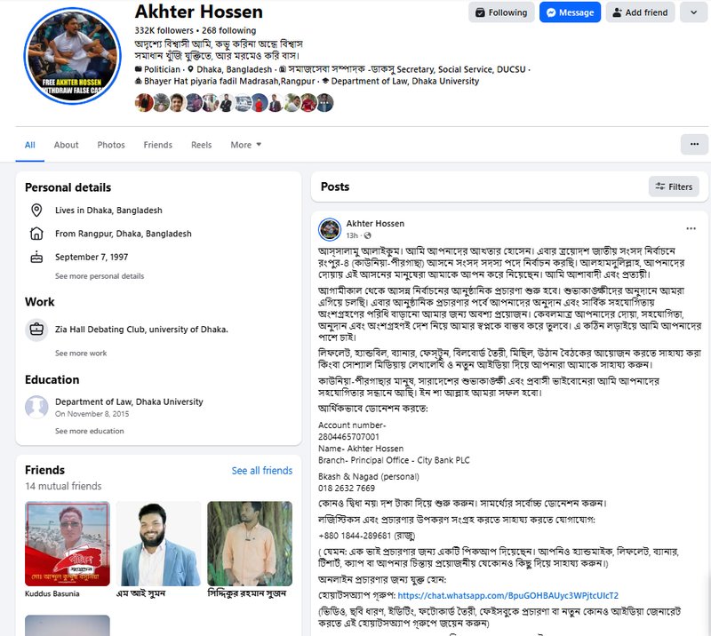 ফেসবুক আইডিতে আখতার হোসেন আরও উল্লেখ করেন, ‘লিফলেট, হ্যান্ডবিল, ব্যানার, ফেস্টুন, বিলবোর্ড তৈরি, মিছিল, উঠান বৈঠকের আয়োজনের পাশাপাশি সোশ্যাল মিডিয়ায় লেখালেখি ও নতুন আইডিয়া দিয়ে আপনারা আমাকে সাহায্য করুন। কোনো দ্বিধা নয়, দশ টাকা দিয়ে শুরু করুন। সামর্থ্যের সর্বোচ্চ ডোনেশন করুন। কাউনিয়া-পীরগাছার মানুষ, সারা দেশের শুভাকাঙ্ক্ষী এবং প্রবাসী ভাইবোনেরা আমি আপনাদের সহযোগিতার সন্ধানে আছি। ইনশা আল্লাহ আমরা সফল হব।’