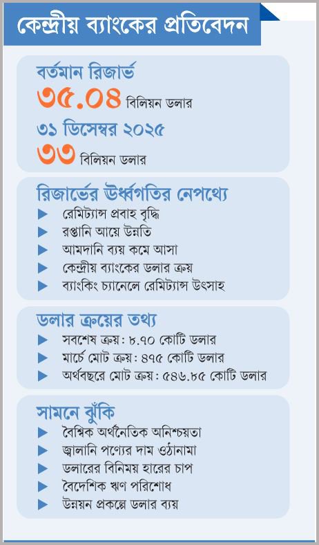 অর্থনীতিবিদেরা বলছেন, ৩৫ বিলিয়ন ডলারের বেশি রিজার্ভ দেশের আমদানি ব্যয় মেটাতে একটি স্বস্তিদায়ক অবস্থান নির্দেশ করে। সাধারণভাবে তিন থেকে পাঁচ মাসের আমদানি ব্যয় মেটানোর মতো রিজার্ভ থাকাকে নিরাপদ ধরা হয় এবং বর্তমান অবস্থান সেই সীমার মধ্যেই রয়েছে। ফলে স্বল্প মেয়াদে বৈদেশিক লেনদেনে চাপ কিছুটা কমবে বলেই ধারণা করা হচ্ছে।
