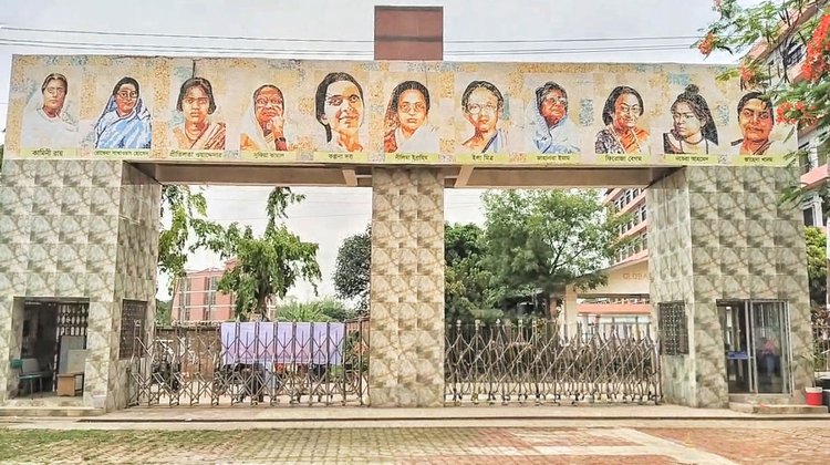 ‘জ্ঞানের প্রবেশদ্বার’ পেরিয়ে গণস্বাস্থ্য ফার্মাসিউটিক্যালস ও ঘোড়াপীর মাজার অতিক্রম করলে ডান পাশে চোখে পড়বে মূল ফটকটি। এর বাইরের দেয়ালে ভাষা আন্দোলনের দৃশ্য— ‘আমার ভাইয়ের রক্তে রাঙানো একুশে ফেব্রুয়ারি, আমি কি ভুলিতে পারি’। ভেতরের দেয়ালে খোদাই করা আছে বাংলার বিপ্লবী নারীদের মুখাবয়ব—বেগম রোকেয়া, সুফিয়া কামাল, ইলা মিত্র, জাহানারা ইমাম, নভেরা আহমেদসহ অনেকে। এই শিল্পকর্ম নারীর সংগ্রাম, প্রতিবাদ এবং অবদানের ইতিহাসকে স্থায়ী রূপ দিয়েছে।