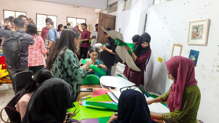 আজ রোববার (১২ এপ্রিল) বিশ্ববিদ্যালয়ের শান্ত চত্বর, চারুকলা অনুষদসহ বিভিন্ন স্থান ঘুরে দেখা যায়, উৎসবমুখর পরিবেশে শিক্ষার্থীরা বর্ষবরণের শেষ মুহূর্তের প্রস্তুতিতে ব্যস্ত সময় পার করছেন। বাঁশ, কাগজসহ দেশীয় উপকরণ ব্যবহার করে তৈরি করা হচ্ছে বিভিন্ন শৈল্পিক কাঠামো। পাশাপাশি রং-তুলির আঁচড়ে ফুটিয়ে তোলা হচ্ছে বাঙালির ঐতিহ্য ও সংস্কৃতির নানা দিক।