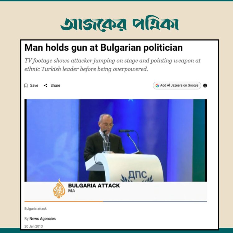 বিষয়টি নিয়ে আরও অনুসন্ধানে ‘Man holds gun at Bulgarian politician’ শিরোনামে একই ২০১৩ সালের ২০ জানুয়ারি প্রকাশিত Al Jazeera-এর একটি প্রতিবেদন পাওয়া যায়। প্রতিবেদনে বলা হয়, বুলগেরিয়ার রাজধানী সোফিয়ায় ২০১৩ সালের জানুয়ারি মাসে একটি রাজনৈতিক সম্মেলন চলাকালে দেশটির সংখ্যালঘু তুর্কিদের রাজনৈতিক দল ‘মুভমেন্ট ফর রাইটস অ্যান্ড ফ্রিডমস’ (MRF)-এর তৎকালীন নেতা আহমেদ দোগান যখন মঞ্চে ভাষণ দিচ্ছিলেন, তখন ২৫ বছর বয়সী এক যুবক হঠাৎ দৌড়ে মঞ্চে উঠে তাঁর মাথায় পিস্তল তাক করে।