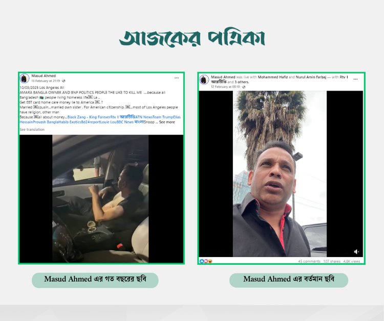 ‘Masud Ahmed’ অ্যাকাউন্টটিতে পোস্ট করা একাধিক ভিডিওতে এক ব্যক্তির নিজেকে আমেরিকা প্রবাসী বলে পরিচয় দিতে দেখা যায়। নাম বলেন— মাসুদ আহমেদ। গত ১৩ ফেব্রুয়ারি শেয়ার করা ভিডিওর ইংরেজি ক্যাপশনে লেখা রয়েছে, ‘১০ মার্চ ২০২৫, লস অ্যাঞ্জেলেস, “আমার বাংলা”-র মালিক ও বিএনপির সঙ্গে জড়িত কিছু লোক আমাকে হত্যার হুমকি দিচ্ছে। তাদের বিরুদ্ধে অভিযোগ, তারা লস অ্যাঞ্জেলেসে বসবাসকারী বাংলাদেশিদের নিয়ে নানা অনিয়মে জড়িত। কিছু মানুষ নিজেদের গৃহহীন দেখিয়ে যুক্তরাষ্ট্র সরকারের ইবিটি কার্ড ও হোম কেয়ার ভাতা নিচ্ছে।’