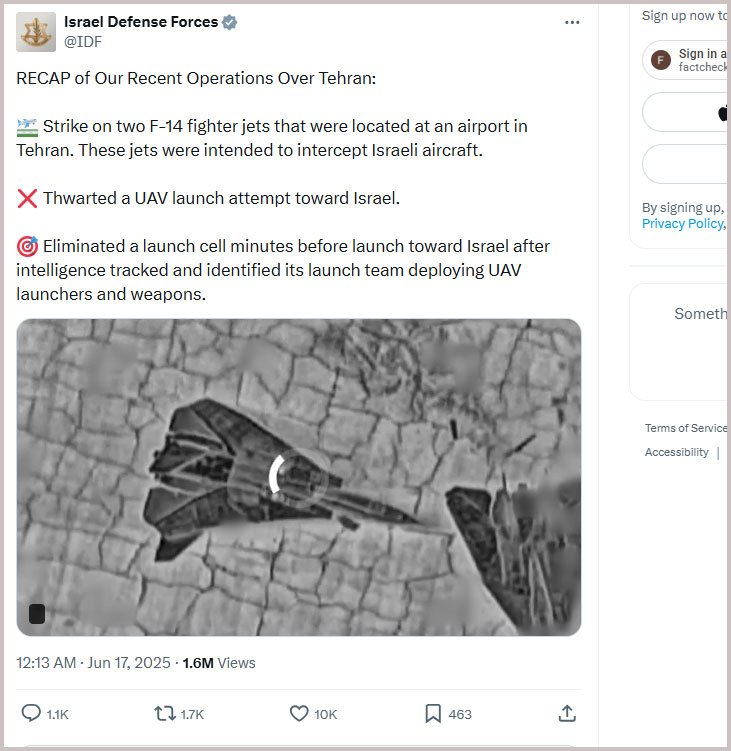 বিষযটি নিয়ে অনুসন্ধানে দেখা যায়, ভিডিওটি আসলে ইসরায়েলি প্রতিরক্ষা বাহিনীর (আইডিএফ) এক্স হ্যান্ডলে ২০২৫ সালের ১৬ জুন পোস্ট করা হয়েছিল। সেটি ছিল ইনফ্রারেড টার্গেটিং ক্যামেরায় ধারণ করা ফুটেজ, যেখানে তেহরানের মেহরাবাদ বিমানবন্দরের কাছে দুটি এফ-১৪এ টমক্যাট যুদ্ধবিমানকে লক্ষ্য করে হামলা চালানো হয় বলে পোস্টে জানানো হয়।