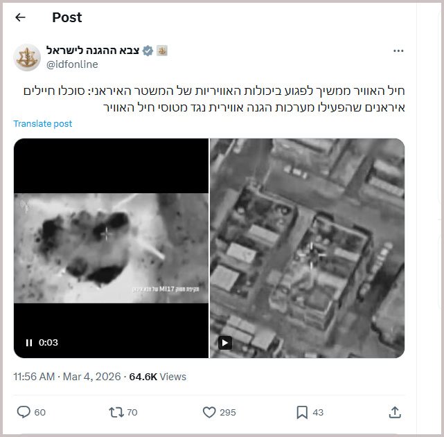 চলমান সংঘাতে একটি এমআই-১৭ (Mi-17) হেলিকপ্টারে ধ্বংস করার দাবি করে ইসরায়েলি প্রতিরক্ষা বাহিনী (আইডিএফ) একটি ভিডিও প্রকাশ করে। গত ৪ মার্চ আইডিএফ-এর অফিশিয়াল এক্স হ্যান্ডলে প্রকাশিত ঝাপসা ইনফ্রারেড ফুটেজে দেখা যায়, ইরানের দুটি স্থানে বিস্ফোরণ ঘটছে এবং ইরানি সম্পদ ও ভবন ধ্বংস হচ্ছে।