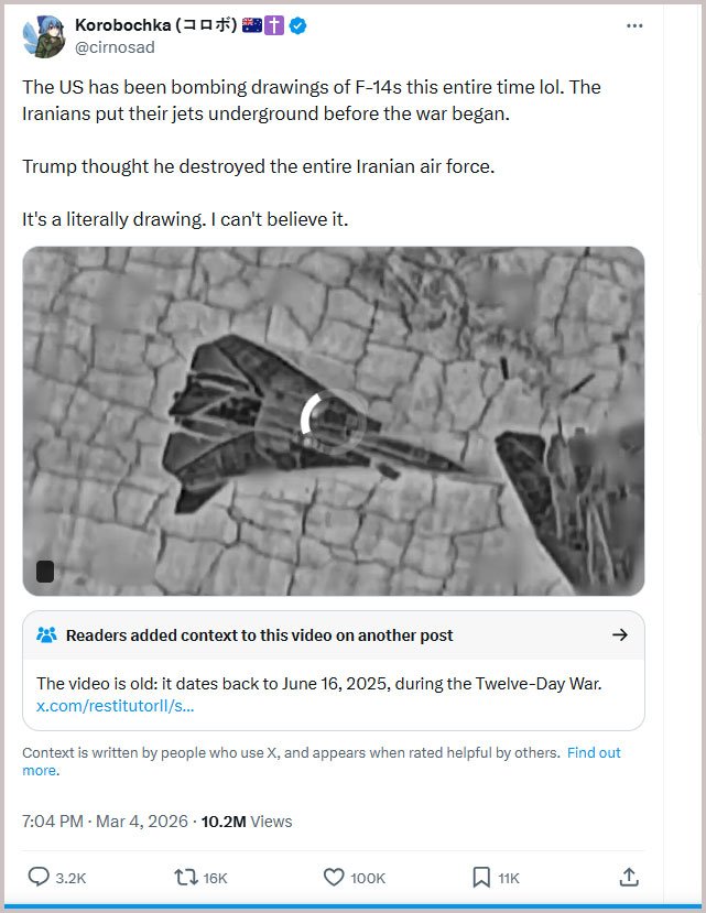 তবে বিষয়টিকে সন্দেহের চোখে রেখে ‘কোরোবোচকা’ (Korobochka) নামক একটি এক্স অ্যাকাউন্ট থেকে ১১ সেকেন্ডের একটি ক্লিপ শেয়ার করা হয়েছে। শেয়ার করা ভিডিওতে দেখা যাচ্ছে, একটি বিমানের নকশার মতো দেখতে কিছুর ওপর বোমা ফেলা হচ্ছে। পোস্টে দাবি করা হয়, ‘যুদ্ধ শুরু হওয়ার আগেই ইরানিরা তাদের যুদ্ধবিমানগুলো মাটির নিচে নিয়ে গেছে। ট্রাম্প ভেবেছিলেন তিনি পুরো ইরানি বিমানবাহিনী ধ্বংস করে দিয়েছেন, কিন্তু এটি স্রেফ একটি আঁকা ছবি। আমি বিশ্বাসই করতে পারছি না!’
