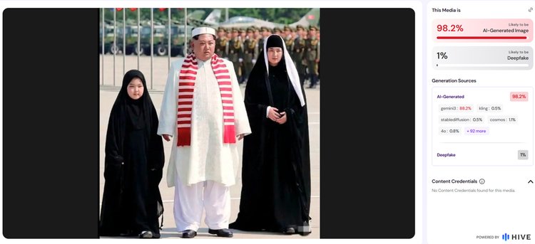 উত্তর কোরিয়ার প্রেসিডেন্ট কিম জং উন ও তাঁর পরিবার মুসলিমদের ধর্মীয় পোশাকে ঈদের শুভেচ্ছা জানিয়েছেন—এমন দাবিতে ছড়িয়ে পড়া ছবিটি ভুয়া। এটি কৃত্রিম বুদ্ধিমত্তা (এআই) দিয়ে তৈরি করা হয়েছে।