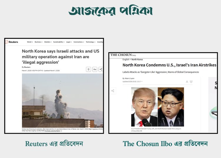 এ ছাড়া দক্ষিণ কোরিয়ার প্রভাবশালী দৈনিক The Chosun Ilbo–এর ইংরেজি সংস্করণেও ‘North Korea Condemns U.S., Israel’s Iran Airstrikes’ শিরোনামে ২ মার্চ একটি প্রতিবেদন প্রকাশিত হয়েছে।