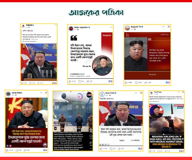 ‘যদি ইরান চায়, আমরা ইসরায়েলের বিরুদ্ধে ক্ষেপণাস্ত্র সরবরাহ করব। এটি মুছে ফেলার জন্য একটি ক্ষেপণাস্ত্রই যথেষ্ট’—কিম জং উনের এমন মন্তব্য দাবিতে জাতীয় ও আন্তর্জাতিক গণমাধ্যম এবং সামাজিক যোগাযোগমাধ্যমে একটি ফটোকার্ড ছড়িয়ে পড়েছে।