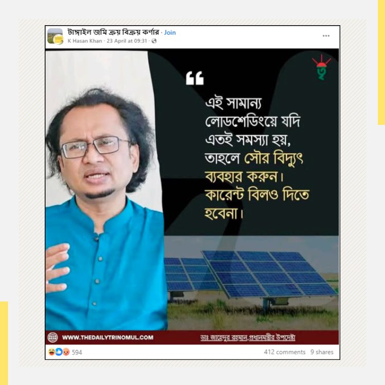 সাম্প্রতি ‘প্রধানমন্ত্রীর তারেক রহমানের পলিসি অ্যান্ড স্ট্র্যাটেজি উপদেষ্টা জাহেদ উর রহমান’-এর নামে একটি ফটোকার্ড ছড়ানো হয়। সেখানে বলা হয়েছে, তিনি মন্তব্য করেছেন—‘এই সামান্য লোডশেডিংয়ে যদি এতই সমস্যা হয়, তাহলে সৌর বিদ্যুৎ ব্যবহার করুন, কারেন্ট বিলও দিতে হবে না।’