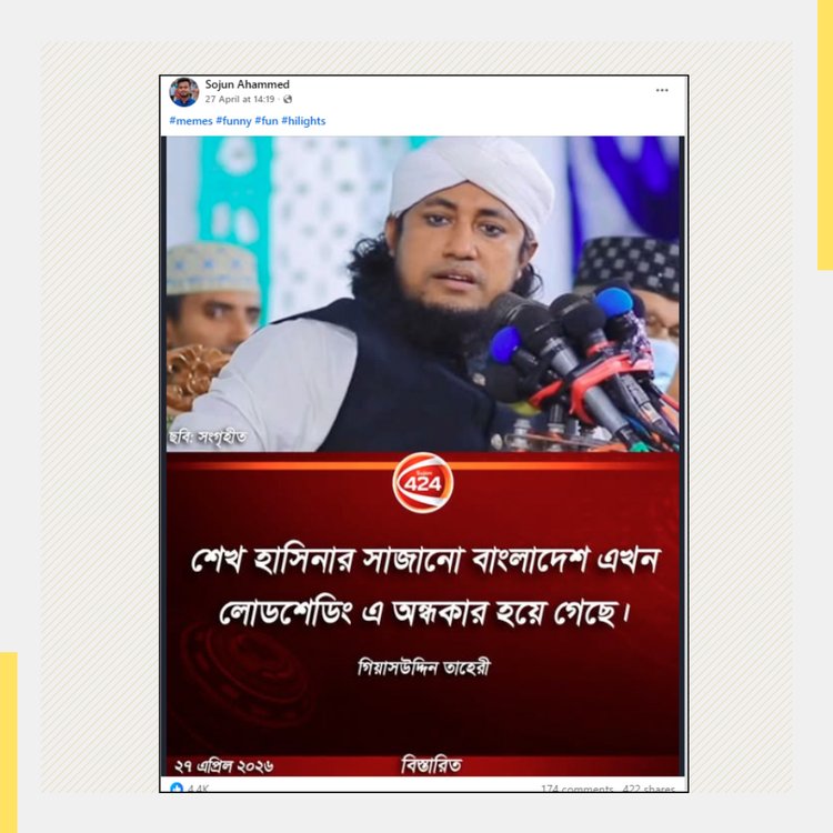 ইসলামি বক্তা গিয়াসউদ্দিন তাহেরীর নামেও একটি ফটোকার্ড ছড়িয়েছে, যেখানে দাবি করা হয়—তিনি বলেছেন, ‘শেখ হাসিনার সাজানো বাংলাদেশ এখন লোডশেডিংয়ে অন্ধকার হয়ে গেছে।’