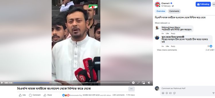 বিষয়টি যাচাই করতে সংশ্লিষ্ট কি-ওয়ার্ড ব্যবহার করে অনুসন্ধান করা হলে বেসরকারি টেলিভিশন ‘চ্যানেল আই’-এর ভেরিফায়েড ফেসবুক পেজে একটি ভিডিও পাওয়া যায়। চলতি বছরের ১২ ফেব্রুয়ারি প্রকাশিত ওই ভিডিওর ক্যাপশনে লেখা, ‘বিএনপি নামক দলটিকে বাংলাদেশ থেকে নিশ্চিহ্ন করে দেবো।’