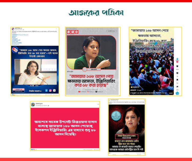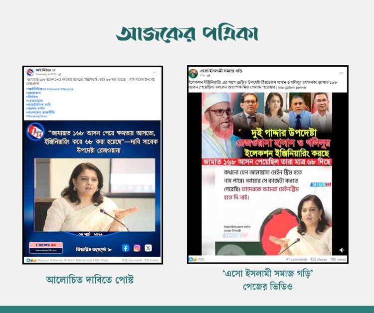 ‘জামায়াত ১৬৮ আসন পেয়ে ক্ষমতায় আসত, ইঞ্জিনিয়ারিং করে ৬৮ করা হয়েছে’—সাবেক উপদেষ্টা সৈয়দা রিজওয়ানা হাসানের উদ্ধৃতি দাবিতে এমন একটি ফটোকার্ড সামাজিক যোগাযোগমাধ্যমে ছড়িয়ে পড়েছে।