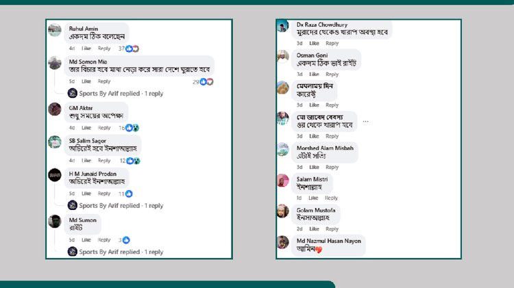 কমেন্ট পর্যবেক্ষণ করে দেখা যায়, অধিকাংশ ব্যবহারকারী বক্তব্য সমর্থন জানিয়ে কমেন্ট করেছেন। রুহুল আমিন নামের একটি অ্যাকাউন্ট থেকে লেখা হয়, ‘একদম ঠিক।’ জি এম আক্তার নামের একটি অ্যাকাউন্ট থেকে মন্তব্য করা হয়, ‘অচিরেই ইনশাআল্লাহ।’