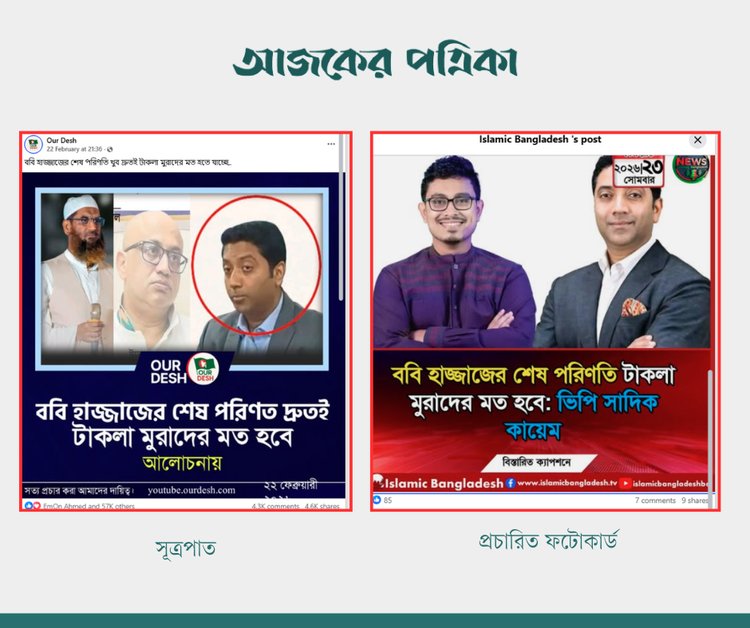 ‘Our Desh’ পেজের ফটোকার্ডে বাংলাদেশ খেলাফত মজলিসের আমির মামুনুল হক, ক্ষমতাচ্যুত সরকারের সাবেক তথ্য প্রতিমন্ত্রী মোহাম্মদ মুরাদ হাসান এবং বর্তমান শিক্ষা প্রতিমন্ত্রী ববি হাজ্জাজের ছবি ব্যবহার করা হলেও সেখানে সাদিক কায়েমের ছবি বা নাম নেই।