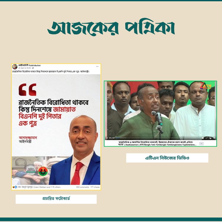 জামায়াত-বিএনপি নিয়ে আইনমন্ত্রী মো. আসাদুজ্জামানের বক্তব্য বিকৃত করে ছড়ানো হয়েছে। প্রচারিত ফটোকার্ডের একটি স্যাটায়ার পেজ থেকে ছড়ানো এবং অপরটি কালবেলার ফটোকার্ড সম্পাদিত করে প্রচার করা হয়েছে।