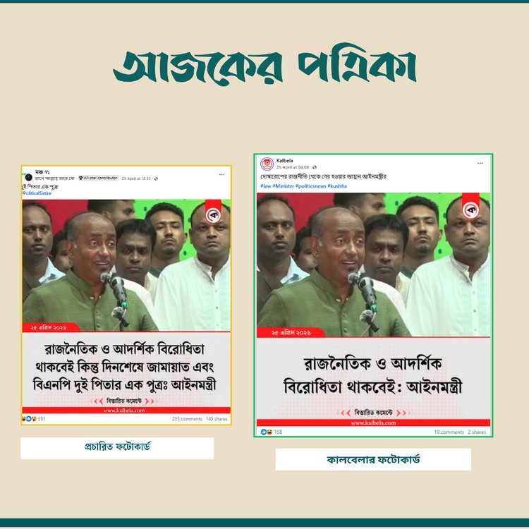 একই দাবিতে জাতীয় দৈনিক কালবেলার লোগো ও ফটোকার্ডের ডিজাইন সংবলিত ফটোকার্ডও ছড়াতে দেখা গেছে। তবে কালবেলার ভেরিফায়েড ফেসবুক পেজ ও ওয়েবসাইটে এমন কোনো প্রতিবেদন পাওয়া যায়নি।