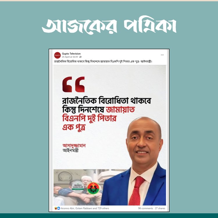 ‘রাজনৈতিক ও আদর্শিক বিরোধিতা থাকবেই, কিন্তু দিনশেষে জামায়াত-বিএনপি দুই পিতার এক পুত্র’—আইনমন্ত্রী মো. আসাদুজ্জামানের নামে এমন একটি উদ্ধৃতি সামাজিক যোগাযোগমাধ্যমে ছড়িয়ে পড়েছে।