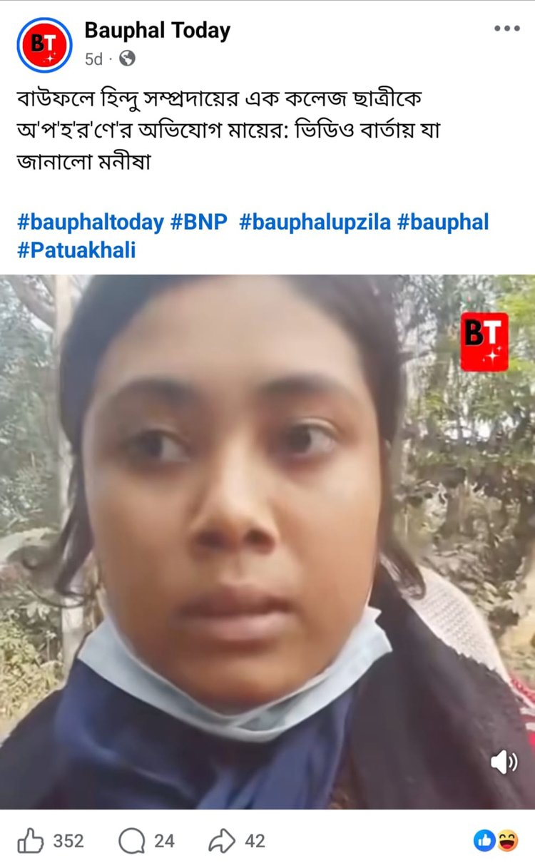 অনুসন্ধানে Bauphal Today নামক একটি ফেসবুক পেজে গত ১০ ফেব্রুয়ারি “বাউফলে হিন্দু সম্প্রদায়ের এক কলেজ ছাত্রীকে অ’প’হ’র’ণে’র অভিযোগ মায়ের: ভিডিও বার্তায় যা জানাল মনীষা” শিরোনামে ৫০ সেকেন্ডের একটি ভিডিও খুঁজে পাওয়া যায়।