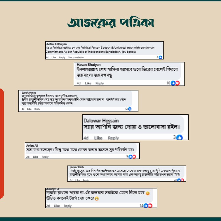 এসব পোস্টের কমেন্ট যাচাই করে দেখা যায়, বেশিরভাগ ব্যবহারকারী মির্জা ফখরুল ইসলাম আলমগীরের নামে প্রচারিত এই বক্তব্যকে সত্য মনে করে কমেন্ট করেছেন।