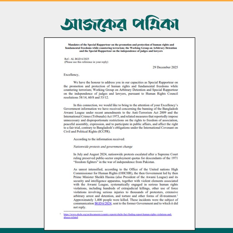 বিষয়টি নিয়ে আরও অনুসন্ধানে জাতিসংঘের মানবাধিকার বিষয়ক হাইকমিশনের ওয়েবসাইটে ২০২৫ সালের ২৯ ডিসেম্বর প্রকাশিত একটি চিঠি পাওয়া যায়। ওই চিঠিতে বাংলাদেশে আওয়ামী লীগের রাজনৈতিক কর্মকাণ্ড নিষিদ্ধ করার বিষয়টি নিয়ে উদ্বেগ প্রকাশ করা হয়। সেখানে বলা হয়, এমন সিদ্ধান্ত সংগঠনের স্বাধীনতা, শান্তিপূর্ণ সমাবেশ ও মতপ্রকাশের অধিকারের ওপর অপ্রয়োজনীয় ও অসামঞ্জস্যপূর্ণ সীমাবদ্ধতা তৈরি করতে পারে। পাশাপাশি, মানবাধিকার লঙ্ঘনের অভিযোগে অভিযুক্ত ব্যক্তিদের আন্তর্জাতিক মানদণ্ড অনুযায়ী স্বাধীন ও নিরপেক্ষ বিচার নিশ্চিত করার বিষয়েও জোর দেওয়া হয়।