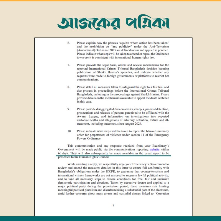 তবে ওই চিঠিতে কোথাও ‘৬০ দিনের মধ্যে নিষেধাজ্ঞা তুলে নেওয়া’ বা এমন কোনো সময়সীমা নির্ধারণের কথা বলা হয়নি। বরং ১৮ পৃষ্ঠার চিঠিটির ৯ পৃষ্ঠার শেষ প্যারায় জানানো হয়েছে, এই যোগাযোগ এবং সরকারের কাছ থেকে প্রাপ্ত যেকোনো প্রতিক্রিয়া ৬০ দিনের মধ্যে যোগাযোগ প্রতিবেদন ওয়েবসাইটের মাধ্যমে প্রকাশ করা হবে। পরবর্তীকালে মানবাধিকার পরিষদে উপস্থাপিতব্য নিয়মিত প্রতিবেদনেও এগুলো উল্লেখ করা হবে।
