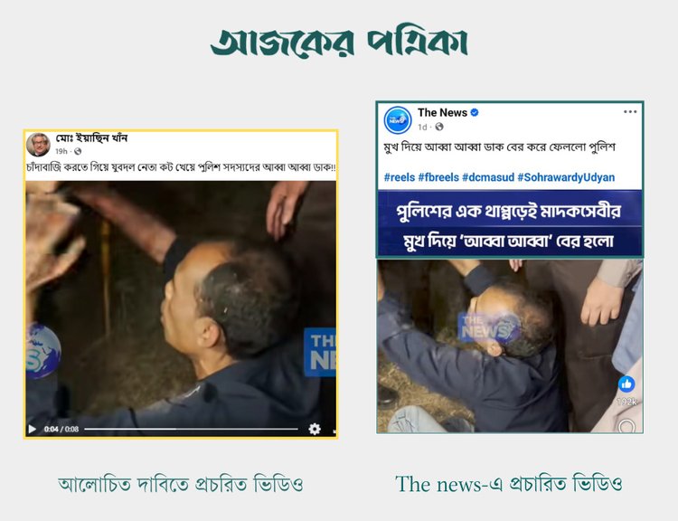 ২৪ ফেব্রুয়ারি পেজটিতে শেয়ার করা ভিডিওটির প্রথম ৮ সেকেন্ডের সঙ্গে প্রচারিত ভিডিওর হুবহু মিল পাওয়া যায়। ভিডিওর বাকি অংশে দেখা যায়, বাংলাদেশ পুলিশের কয়েকজন সদস্য আটককৃত ব্যক্তিকে চারদিক থেকে ঘিরে রেখেছেন। এ সময় এক পুলিশ সদস্যকে বলতে শোনা যায়, ‘পুলিশ দেখলে দৌড় দেওয়া যাবে না।’ তখন পুলিশকে উদ্দেশ করে ওই ব্যক্তিকে বলতে শোনা যায়, ‘আমি দৌড় দিইনি তো। আমি “বাবা বাবা” বলে বসে পড়েছি।’
