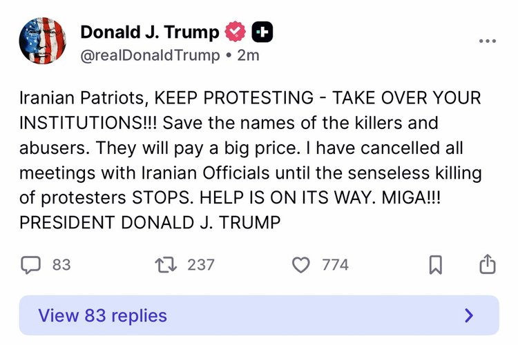 এ বিষয়ে পোস্টে তিনি লিখেছেন, ‘বিক্ষোভকারীদের অর্থহীন হত্যাকাণ্ড বন্ধ না হওয়া পর্যন্ত আমি ইরানি কর্মকর্তাদের সঙ্গে সব বৈঠক বাতিল করেছি। সহায়তা আসছে। MIGA!!!’