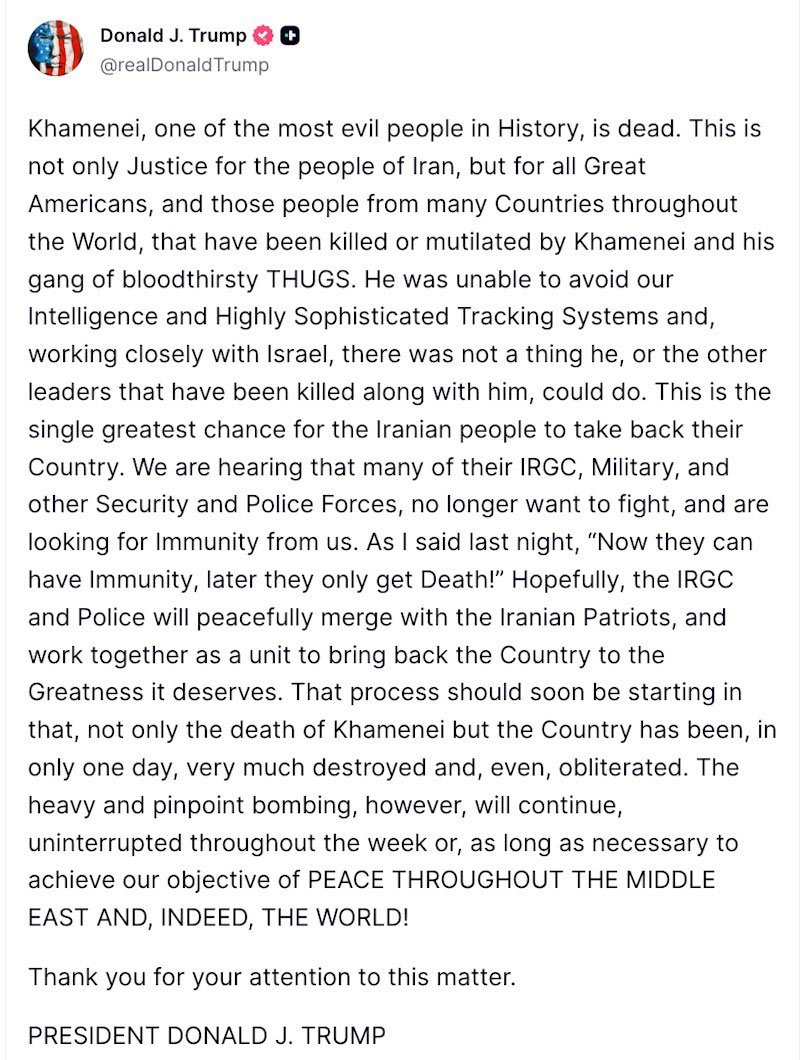 প্রেসিডেন্ট ট্রাম্প তাঁর পোস্টে লিখেছেন, ‘ইতিহাসের অন্যতম নিকৃষ্ট ব্যক্তি খামেনি মারা গেছেন। খামেনি ও তাঁর রক্তপিপাসু বাহিনীর হাতে নিহত বা পঙ্গু হওয়া অসংখ্য আমেরিকান এবং বিশ্ববাসীর জন্য আজ সুবিচার প্রতিষ্ঠিত হলো।’