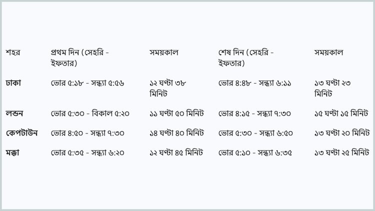নিচে বিশ্বের প্রধান কয়েকটি শহরের প্রথম ও শেষ দিনের সাহরি, ইফতার এবং রোজার সম্ভাব্য সময় দেওয়া হলো—