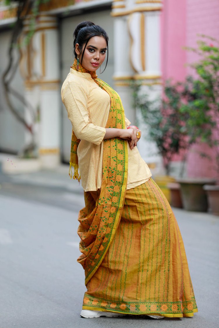 যেহেতু সব সময় শাড়ি পরেন না, তাই সুতি শাড়ি বেছে নিন। একবার শক্তপোক্তভাবে পরে নিলে আর চিন্তা নেই। মাঝেমধ্যে একটু কুঁচি ঠিক করে নিতে হবে, এই যা। সুতির ওপর স্ক্রিনপ্রিন্ট, ব্লক কিংবা বাটিক করা শাড়ি বেছে নিন। ফাল্গুনে এ ধরনের শাড়িগুলোই বেশি মানায়। রঙের বেলায় হলুদ, কমলা, বাসন্তী, লেমন, গোলাপি, লাল কিংবা বেগুনি রং বেছে নিতে পারেন। অন ক্লাউড নাইন অ্যান্ড হাফ-এর স্বত্বাধিকারী এবং ডিজাইনার আফরিন আহমেদ বলেন, ‘যাঁরা সাধারণত শাড়ি পরেন না, তাঁদের জন্য বসন্তবরণে সুতি শাড়ি সহজ ও আরামদায়ক হবে। কারণ, সুতি শাড়ি হালকা, তাই ক্যারি করা সহজ। হুট করে শাড়ি পরাতেও খুব বেশি জমকালো লাগে না। মানে, শাড়ি পরে নিজেকে “নিজের মতোই” প্রেজেন্ট করা যায়।’
