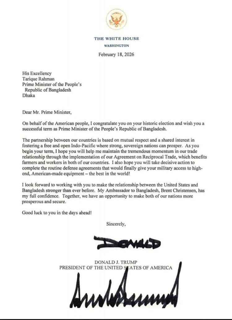 মার্কিন প্রেসিডেন্ট তাঁর চিঠিতে তারেক রহমানকে ‘প্রিয় জনাব প্রধানমন্ত্রী’ উল্লেখ করে বলেন, ‘আমেরিকার জনগণের পক্ষ থেকে আপনাকে আপনার ঐতিহাসিক নির্বাচনী বিজয়ের জন্য অভিনন্দন জানাই। গণপ্রজাতন্ত্রী বাংলাদেশের প্রধানমন্ত্রী হিসেবে আপনার মেয়াদ সফল হোক—এই কামনা করি।’