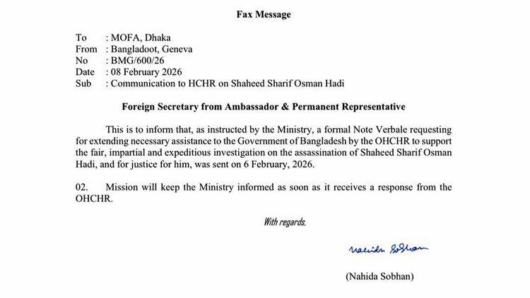 এতে বলা হয়, ‘পররাষ্ট্র মন্ত্রণালয়ের নির্দেশনা অনুযায়ী জেনেভাস্থ বাংলাদেশ স্থায়ী মিশন গত ৬ ফেব্রুয়ারি ২০২৬ তারিখে OHCHR-এর কাছে একটি আনুষ্ঠানিক নোট ভারবাল (Note Verbale) প্রেরণ করেছে। উক্ত নোটে হত্যাকাণ্ডের তদন্তে প্রয়োজনীয় কারিগরি ও প্রাতিষ্ঠানিক সহায়তা প্রদানের জন্য জাতিসংঘের মানবাধিকার দপ্তরের সহযোগিতা কামনা করা হয়েছে।’