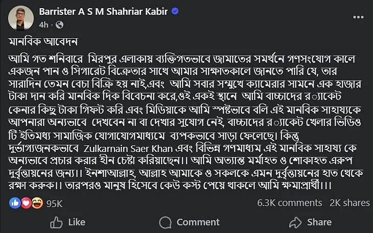 বিষয়টি নিয়ে বিতর্ক শুরু হলে গতকাল সোমবার রাতে নিজের ভেরিফায়েড ফেসবুক পেজে একটি পোস্ট দেন এ এস এম শাহরিয়ার কবির। সেখানে তিনি দাবি করেন, ঘটনাটি সম্পূর্ণ মানবিক দৃষ্টিকোণ থেকে করা হয়েছে। তিনি লেখেন, ‘আমি গত শনিবারে মিরপুর এলাকায় ব্যক্তিগতভাবে জামায়াতের সমর্থনে গণসংযোগকালে একজন পান ও সিগারেট বিক্রেতার সঙ্গে সাক্ষাৎকালে জানতে পারি যে তাঁর সারা দিন তেমন বেচাবিক্রি হয় নাই। আমি সবার সম্মুখে ক্যামেরার সামনে ১ হাজার টাকা দান করি মানবিক দিক বিবেচনা করে।’