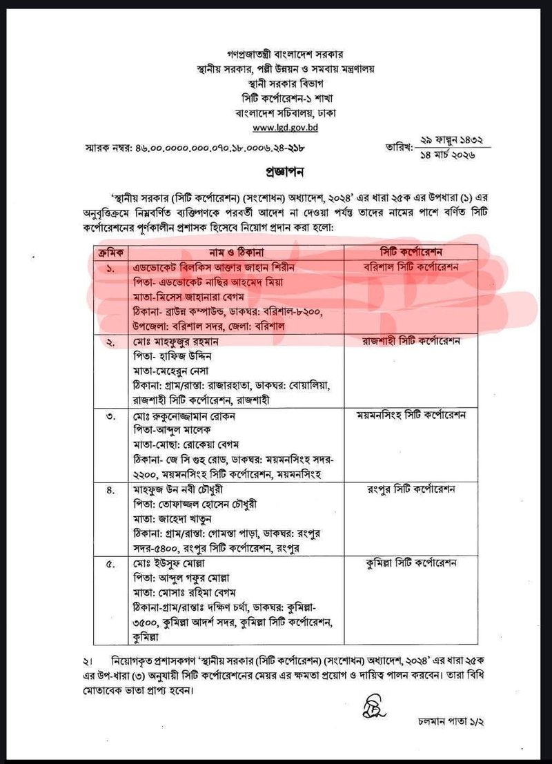 প্রজ্ঞাপনে উল্লেখ করা হয়েছে, স্থানীয় সরকার (সিটি করপোরেশন) (সংশোধন) অধ্যাদেশ, ২০২৪-এর ধারা ২৫ ক-এর উপধারা (১) অনুযায়ী এই নিয়োগ দেওয়া হয়েছে। একই অধ্যাদেশের ২৫ক উপধারা (৩) অনুযায়ী, নিযুক্ত প্রশাসকেরা সংশ্লিষ্ট সিটি করপোরেশনের মেয়রের ক্ষমতা প্রয়োগ ও দায়িত্ব পালন করবেন। তাঁরা বিধিমোতাবেক নির্ধারিত সম্মানী ও ভাতা প্রাপ্য হবেন।
