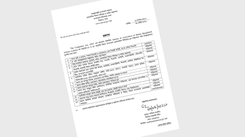 আজ শনিবার বেসামরিক বিমান পরিবহন ও পর্যটন মন্ত্রণালয় থেকে জারি করা এক প্রজ্ঞাপনে এই তথ্য জানানো হয়। ‘The Companies Act, 1994’ এবং বিমানের আর্টিকেলস অব অ্যাসোসিয়েশনের সংশ্লিষ্ট অনুচ্ছেদ অনুযায়ী এই নতুন পরিচালনা পর্ষদ পুনর্গঠন করা হয়েছে।
