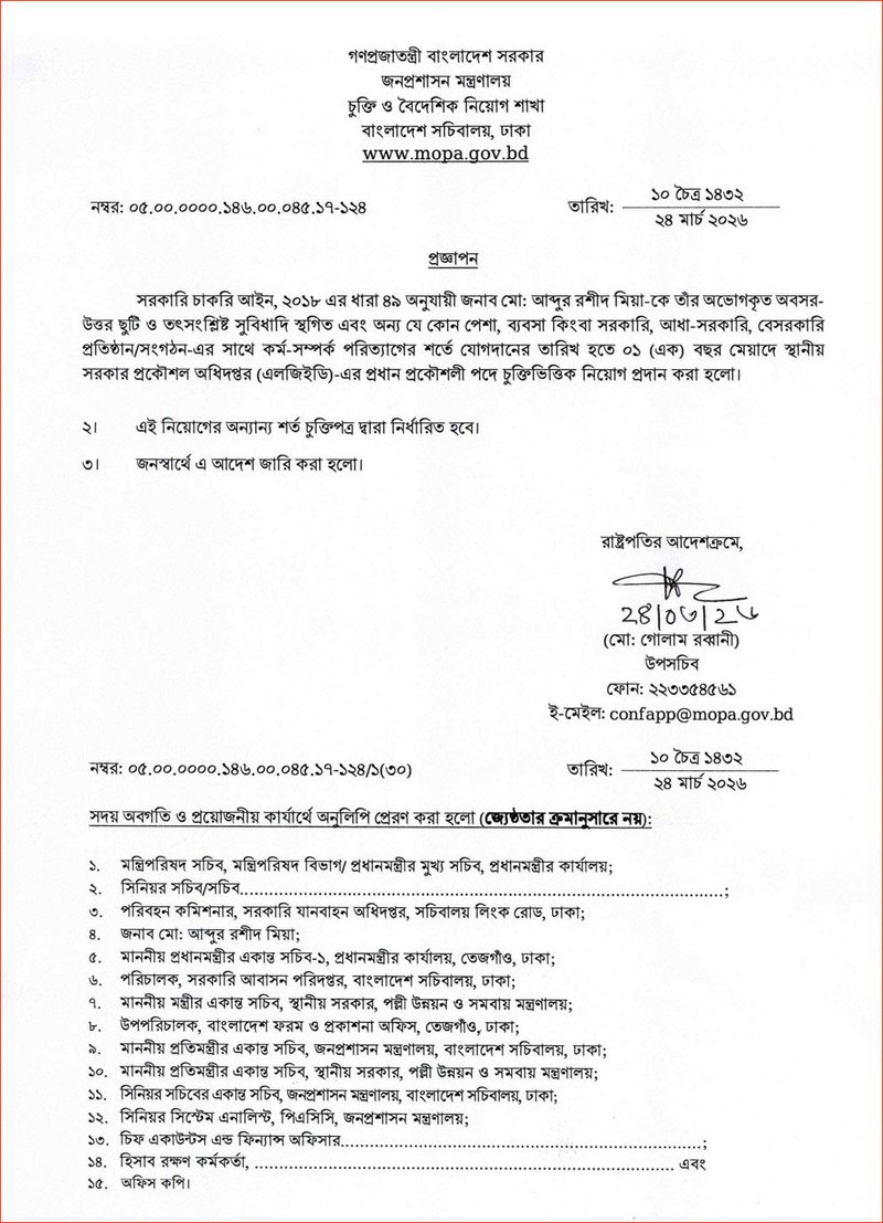 জনপ্রশাসন মন্ত্রণালয়ের উপসচিব মো. গোলাম রব্বানী স্বাক্ষরিত প্রজ্ঞাপনে জানানো হয়েছে, ‘সরকারি চাকরি আইন, ২০১৮’ এর ধারা ৪৯ অনুযায়ী মো. আব্দুর রশীদ মিয়াকে তাঁর অভোগকৃত অবসর-উত্তর ছুটি (পিআরএল) ও সংশ্লিষ্ট সুবিধাদি স্থগিতের শর্তে এই নিয়োগ দেওয়া হয়েছে।