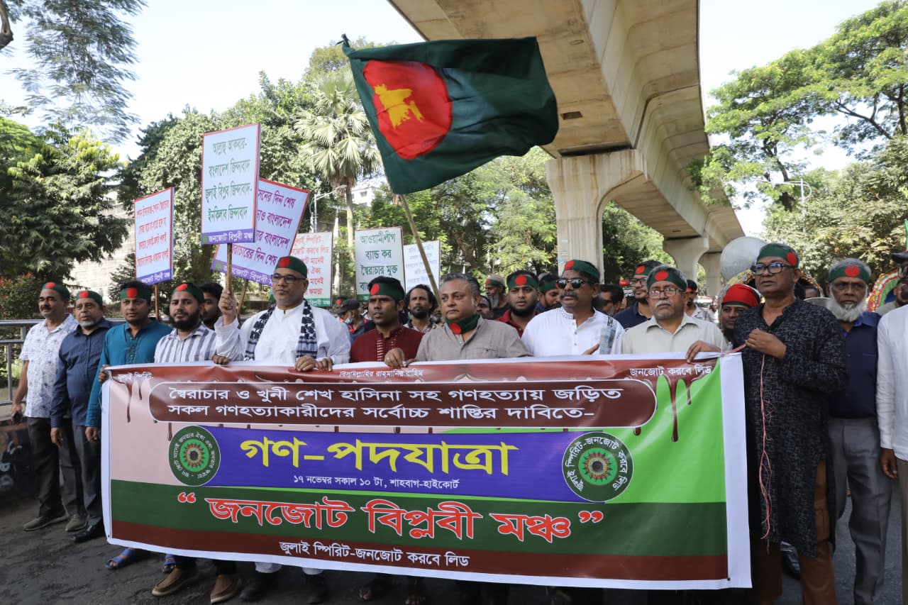 আন্তর্জাতিক অপরাধ ট্রাইব্যুনালে শেখ হাসিনা ও আসাদুজ্জামান খান কামালের সর্বোচ্চ শাস্তির দাবিতে গণপদযাত্রা। ছবি: আজকের পত্রিকা