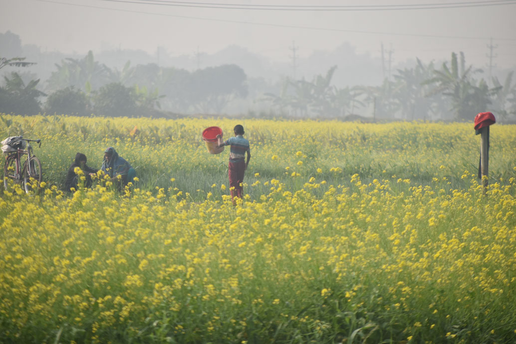 শীতের কুয়াশাভরা সকালে মাঠে নেমেছেন কৃষক–কৃষাণীরা। হলুদ সরিষার ফুলে ভরা জমির মাঝখানে লাগানো পেঁয়াজ তুলতে ব্যস্ত তাঁরা। পরিবারের সঙ্গে শিশুরাও কাজে যোগ দিয়েছে। রাজশাহীর পুঠিয়া উপজেলার বেলপুকুর ইউনিয়নের একটি মাঠ। ছবি: মিলন শেখ