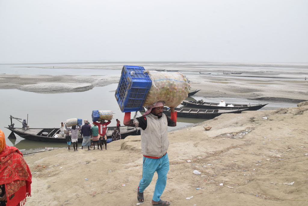 শীতের সকালে পদ্মা নদীর চর মাজারদিয়া গ্রাম থেকে নৌকায় করে নিয়ে আসা হচ্ছে কাঁচা-পাকা টমেটো। এরপর নৌকা থেকে নামিয়ে শ্রমিকেরা ভ্যানে করে বিক্রির জন্য নিয়ে যাচ্ছেন রাজশাহীর কোর্টবাজারে। আজ সোমবার সকালে রাজশাহী হাইটেক পার্ক এলাকায় পদ্মা নদীর ধারে। ছবি: মিলন শেখ