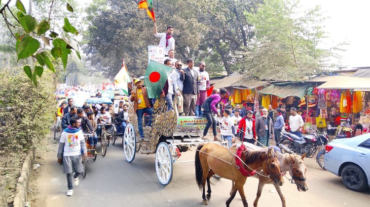 ঘোড়ার গাড়িতে করে বিএনপির ভারপ্রাপ্ত চেয়ারম্যান তারেক রহমানকে অভ্যর্থনা জানাতে ঢাকার ৩০০ ফিটের দিকে যাত্রা করেছেন বিএনপির নেতা–কর্মীরা। বিএনপির জাতীয় নির্বাহী কমিটির সদস্য আবু নাসের রহমাতুল্লাহর নেতৃত্বে প্রায় তিন শতাধিক ঘোড়ার গাড়ি নিয়ে শাহবাগ-বাংলামোটর হয়ে কারওয়ান বাজার থেকে ৩০০ ফিটের দিকে যাত্রা করেন তাঁরা। আজ বৃহস্পতিবার সাড়ে ১২টার দিকে শাহবাগ থেকে ৩০০ ফিটের দিকে যাত্রা করতে দেখা গেছে।