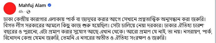 মাহফুজ তাঁর ফেসবুক পোস্টে লিখেছেন, ‘ঢাকা কেন্দ্রীয় কারাগার এলাকায় পার্ক বা জাদুঘর করার আগে সেখানে প্রত্নতাত্ত্বিক অনুসন্ধান করা জরুরি। বিগত লীগ সরকারের আমলে কিছু কাজ শুরু হয়েছিল। সেটা চালিয়ে নেয়া দরকার।’